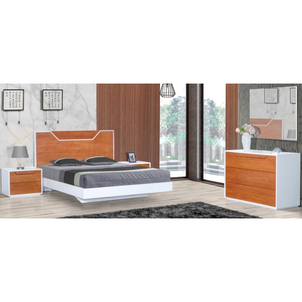 Disponível noutras cores e medidas. Quarto Novo com cama de casal suspensa, colchão, estrado de ripas, 2 camiseiros baixos, cómoda e moldura.